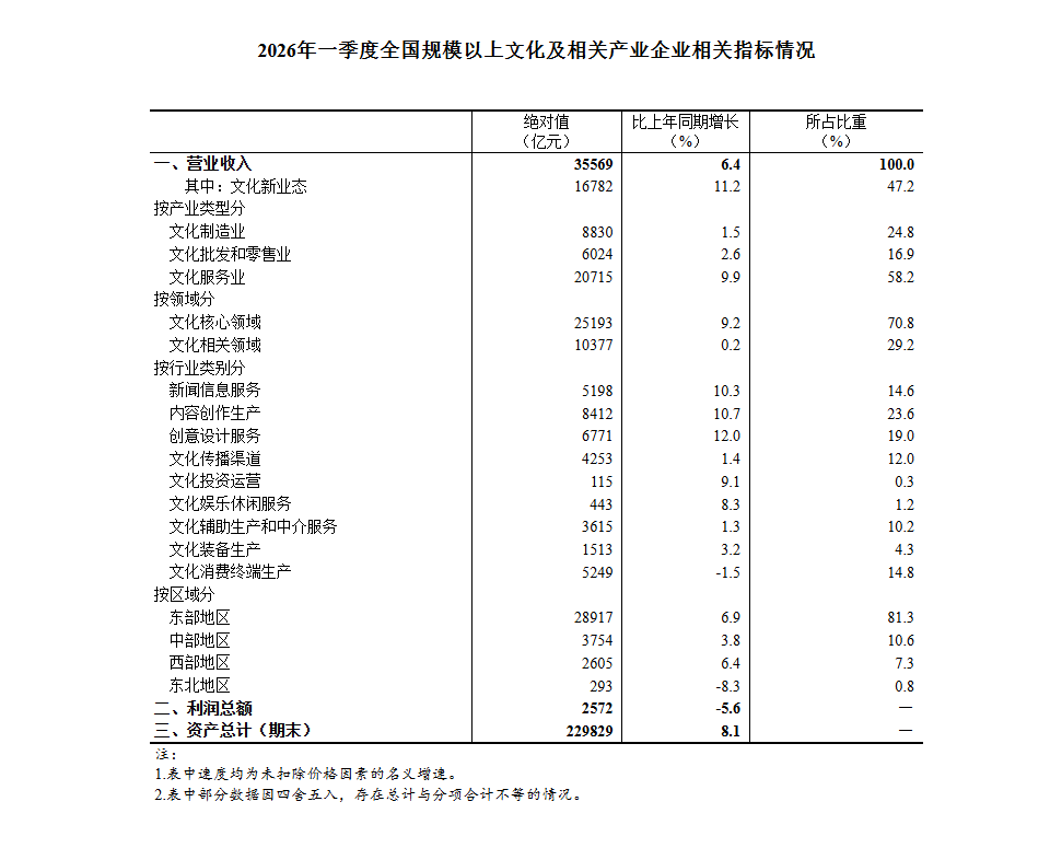 2026年一季度全国规模以上文化及相关产业企业营业收入增长6.4%
