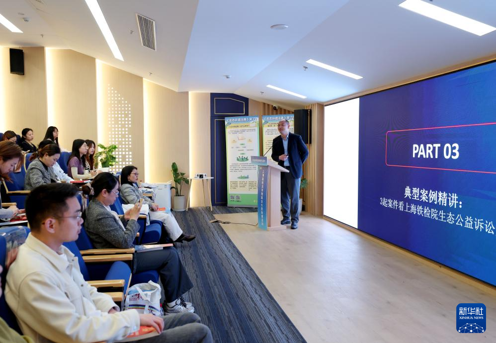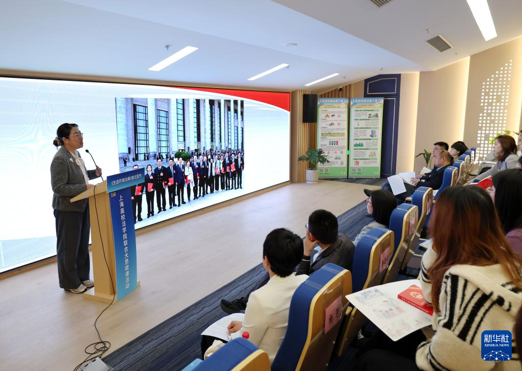 4月28日,位于上海市长宁区的全国人大常委会法工委虹桥街道基层立法联系点举行生态环境法典普法宣传暨上海高校法学院联合大思政课。这是上海铁路运输检察院检察官黄皓翔在活动中授课。