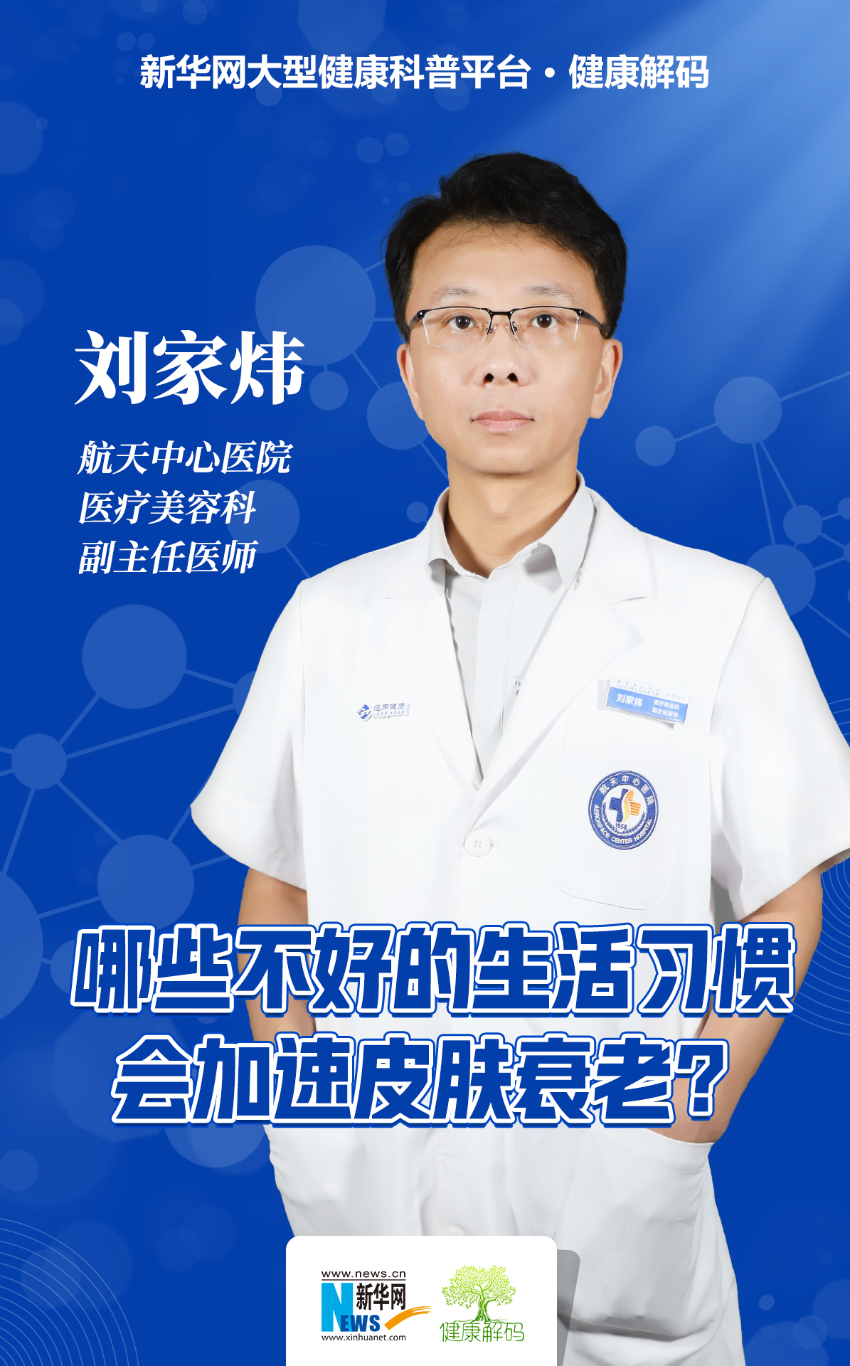 本集节目我们邀请了航天中心医院医疗美容科副主任医师刘家炜分享《哪些不好的生活习惯会加速皮肤衰老?》。