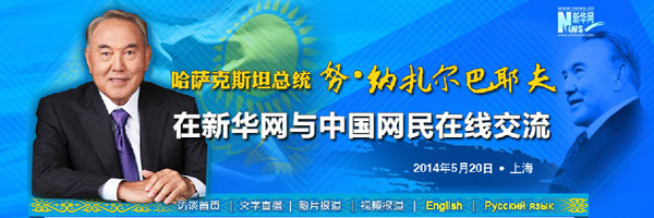 ????新華網上海5月20日電 哈薩克斯坦總統納扎爾巴耶夫20日接受新華網獨家訪談與中國網民在線交流,回答中國網民的問題。
