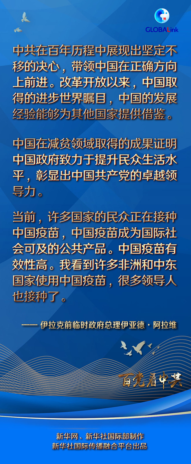阿拉維對中國共產(chǎn)黨百年華誕表示祝賀。他說,中共在百年歷程中展現(xiàn)出堅定不移的決心,帶領中國在正確方向上前進。改革開放以來,中國取得的進步世界矚目,中國的發(fā)展經(jīng)驗能夠為其他國家提供借鑒。
